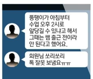 수강생은 수업 시간 변동을 요청했고 해당 강사는 다른 강사의 연락처를 전달했다. 이어 이 필라테스 강사는 메신저 전송 실수로 "뚱땡이가 수업을 앞당길 수 있냐고 물어봤다"는 말을 회원에게 덧붙였다.