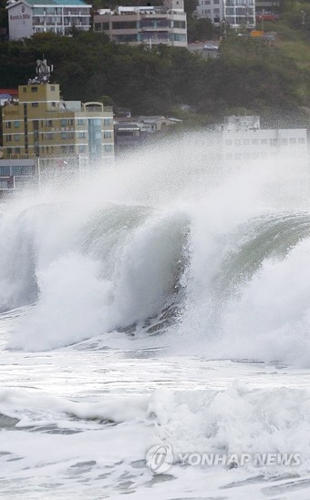 남부권이 제19호 태풍 솔릭 영향권에 들어간 23일 부산 해운대해수욕장 앞바다에서 높은 파도가 해변을 덮치고 있다.