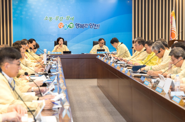 김수영 서울 양천구청장(가운데 왼쪽)이 22일 오전 양천구청 공감기획실에서 19호 태풍 ‘솔릭’ 북상에 따른 사전 점검 및 피해 최소화를 위한 대책회의를 진행하고 있다. 이날 회의에서는 ▲시설물 및 공사장 안전점검 실시 ▲이재민 재해구호 대책 ▲비상대비체계구축 등의 대책을 논의했다. (사진제공=양천구청)