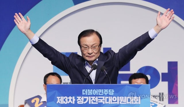 더불어민주당 이해찬 신임 대표가 지난 25일 오후 서울 올림픽 체조경기장에서 열린 전국대의원대회에서 수락연설을 하기에 앞서 손들어 인사하고 있다.