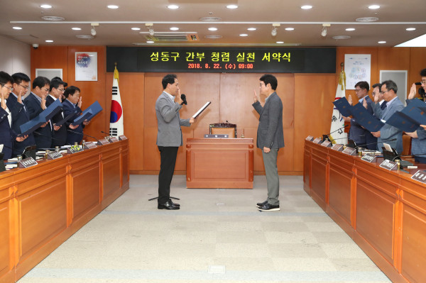최근 서울 성동구는 민선7기 출범을 계기 삼아 전직원의 청렴실천 의지를 다지는 ‘청렴실천 서약식’을 실시했다. 사진은 간부 청렴실천 서약식에서 정원오 구청장(오른쪽)과 구청 간부 전원이 청렴 실천 약속 서약을 하고 있는 모습. (사진제공=성동구청)
