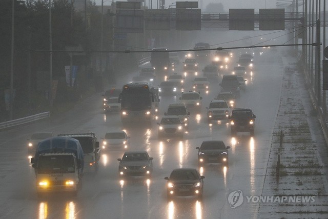 전국적으로 비가 내리는 28일 오후 경기도 고양시 자유로에서 차량이 전조등을 켠 채 빗속을 달리고 있다.