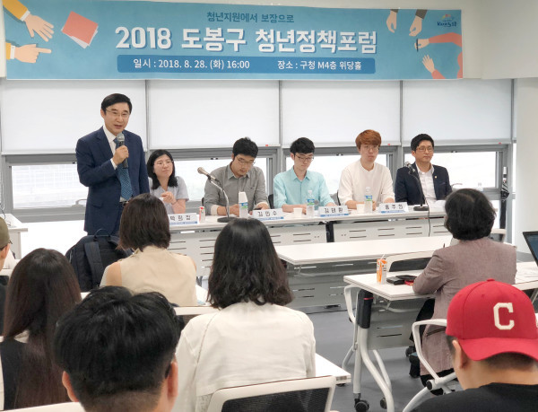 이동진 도봉구청장이 28일 오후 4시 구청 M4 위당홀에서 청년정책 및 활동에 대한 사회적 공감대 조성을 목표로 열린 ‘2018 도봉구 청년정책포럼’에 참석했다. 사진은 행사에 참석한 이 구청장이 포럼에 앞서 축사를 하고 있는 모습. (사진제공=도봉구청)