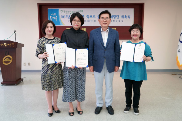 28일 서울 동대문구가 아이들의 학교급식을 꼼꼼히 챙길 93명의 ‘학교급식 학부모 모니터링단’을 위촉했다. 사진은 학부모 급식모니터링단으로 위촉된 단원들과 유덕열 구청장(오른쪽 두번째)이 기념촬영을 하고 있는 모습. (사진제공=동대문구청)