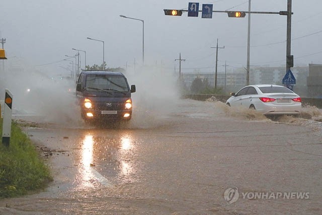 29일 경기도 연천군 초성검문소 인근 도로에서 집중호우로 물이 역류하고 있다.