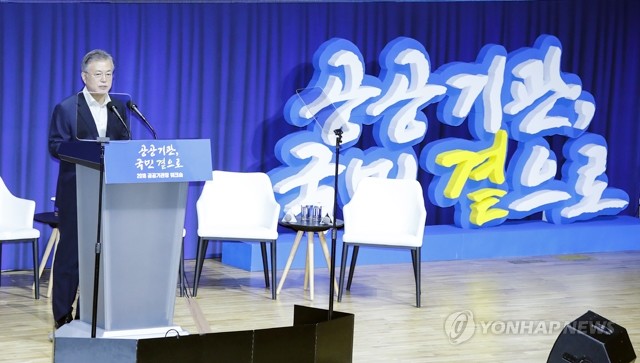 문재인 대통령은 29일 오전 강원도 원주 국민건강보험공단에서 열린 ‘2018 공공기관장 워크숍’에 참석했다. 이 자리에서 문 대통령은 공공기관장들을 향해 “그동안 몇몇 공공기관은 국민의 편이 아니었다. 특권과 반칙의 온상이 돼 국민의 공복이라는 자부심을 잃기도 했다”며 “조직의 명운을 걸고 스스로 깊이 반성해야 할 부분”이라고 지적했다. 그러면서 “국민에게 신뢰받는 공공기관으로 환골탈태하겠다는 비상한 각오로 혁신에 임해주길 바란다”며 “국민이 요구하는 혁신 목표는 분명하다. 한 마디로 공공성을 회복하라는 것”이라고 강조했다.