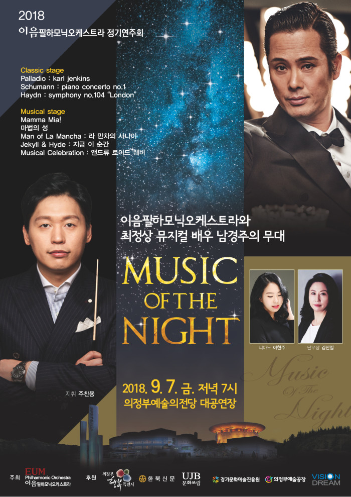 정기연주회를 겸한 이번 ‘Music of the Night’ 음악회 1부 Classic stage에서는 Schumann의 piano concerto no.1 곡을 예원예술대학교 음악학과 재학 중인 이현주가 이음필하모닉오케스트라와 협연하며, Haydn 의 symphony no. 104. ‘London’을 연주한다.