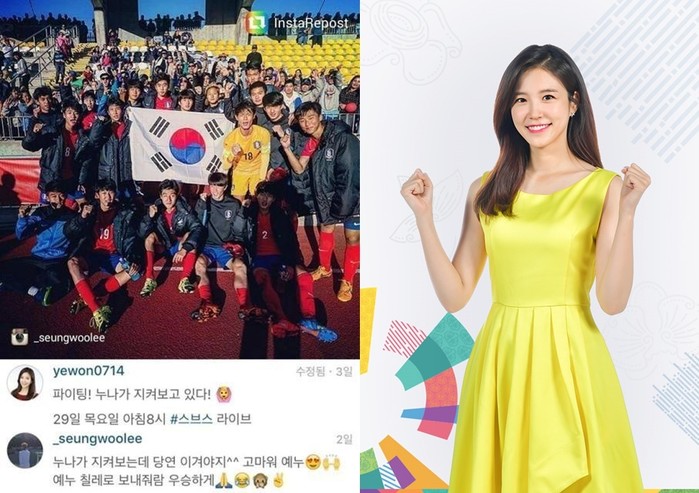 장예원은 지난 27일 자신의 SNS에 "파이팅! 누나가 지켜보고 있다! 29일 목요일 아침 8시 스브스 라이브"란 글과 함께 U-17 한국 대표팀의 사진을 게재했다.