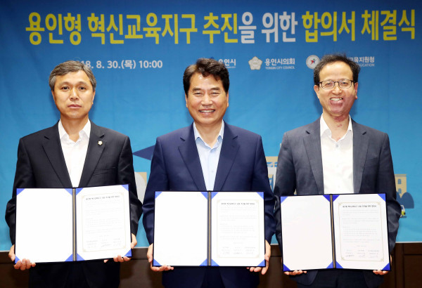 백군기 경기 용인시장은 30일 시장 집무실에서 이건한 용인시의장, 홍기석 용인교육지원청 교육장과 함께 ‘용인형 혁신교육지구사업 추진을 위한 합의서’를 교환했다. 사진은 합의서 교환식에 참석한 이 의장, 백 시장, 홍 교육장(왼쪽부터)이 기념촬영을 하는 모습. (사진제공=용인시청)