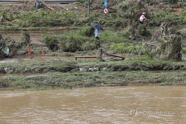 서울에 이틀 연속 쏟아진 폭우로 비 피해가 일어난 가운데 30일 오전 중랑천 산책로에 폭우로 쓰러진 나무와 나뭇가지들이 엉켜있다.