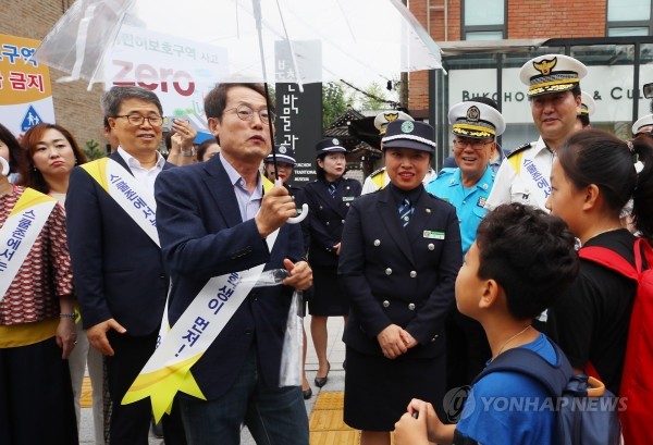 30일 서울 종로구 재동초등학교 앞에서 열린 등굣길 교통안전지도 행사에서 조희연 서울시교육감, 이주민 서울경찰청장이 투명비닐우산을 어린이들에게 나눠주고 있다.