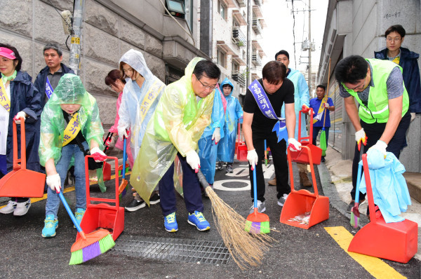 류경기 중랑구청장(가운데)이 보슬비가 내리던 31일 오전 7시 면목2동 주민 30여명과 함께 우비를 입고 동네 골목길을 청소하고 있다. 류 구청장은 취임 이후 매주 빠짐없이 주 1회 주민들과 함께 청소를 하며 중랑구 지역 곳곳을 살피고 있다. (사진제공=중랑구청)