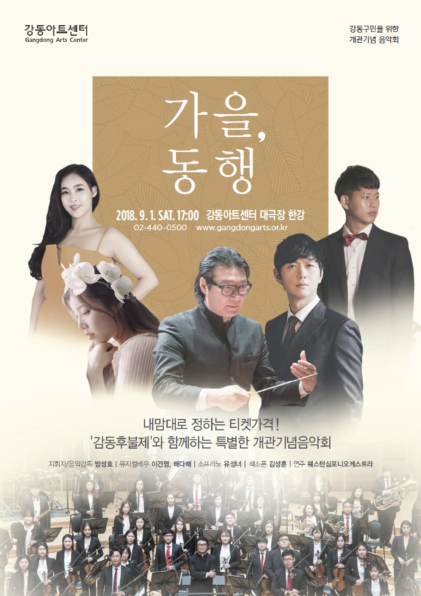 이번 공연에서는 뮤지컬 배우 이건명, 팝페라 가수 배다해가 직접 사회를 맡고 노래도 선사한다. 클래식부터 대중음악, 크로스오버까지 다양한 장르를 소화하는 웨스턴 심포니 오케스트라(지휘 방성호)의 연주에 소프라노 유성녀, 색소포니스트 김성훈이 들려주는 감미로운 선율을 입혀 가을 분위기를 한껏 돋운다.