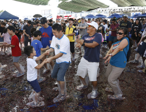 경기 화성시가 지난 1~2일 양일간 서신면 궁평항 일원에서 진행한 ‘2018 화성송산포도축제’가 전국 각지에서 18만명이 참석한 가운데 성황리에 마무리됐다. 사진은 축제 방문객들이 '포도밟기 이벤트'에 참여한 모습. (사진제공=화성시청)