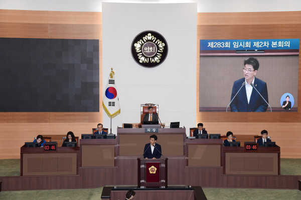| ▲ 김용석 더불어민주당 서울시의회 대표의원이 ‘제283회 임시회 제2차 본회의’에서 교섭단체 대표 연설을 진행하고 있다. (사진제공=서울시의회) | ||