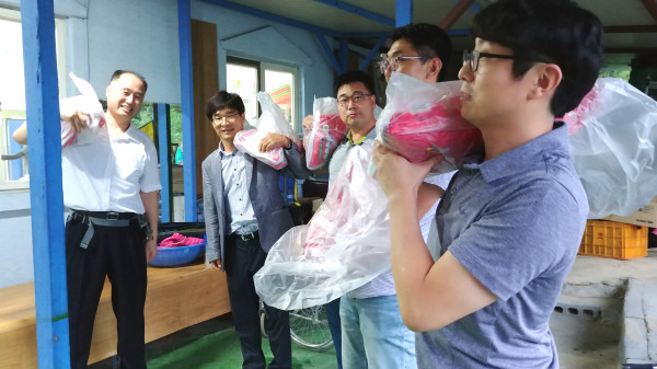 경기 용인시청 공공건축과 직원들이 지난 3일 민족의 명절 한가위를 앞두고 기흥구에 위치한 장애인단체인 나눔공동체에 쌀과 부식비를 기탁했다. 사진은 직원들이 장애인단체에 전달할 쌀을 들고 이동하고 있는 모습. (사진제공=용인시청)