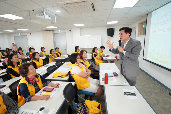 5일 동대문구 자원봉사센터에서 ‘내가 사는 동네에서 자원봉사하기’라는 주제로 진행된 ‘자원봉사상담가 양성 과정’에서 유덕열 구청장이 지역내 자원봉사자 40여명을 대상으로 특강을 진행했다. 사진은 특강 진행 모습. (사진제공=동대문구청)