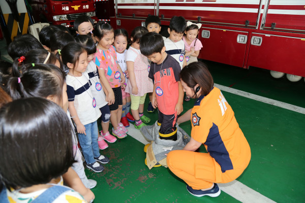 서울 영등포소방서는 5일 오전 도림동에 위치한 성심어린이집 원생과 교사를 대상으로 '눈높이 소방안전교육'을 실시했다. 교육에 참여한 아이들은 화재가 발생했을 때 대피하는 방법과 119 신고방법 등을 배웠다. 사진은 어린이들이 방화복을 입어보고 있는 모습. (사진제공=영등포소방서)