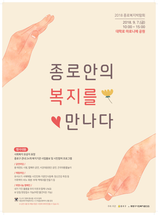 ‘종로 안의 복지를 만나다’라는 주제로 열리는 이번 2018 종로 복지박람회는 '제19회 사회복지의 날'을 맞아 사회복지 발전에 기여한 유공자를 표창하고, 사회복지에 대한 주민의 관심과 참여를 유도해 지역복지를 활성화하고자 마련된 것으로 지역내 복지시설 등 총 25개 단체가 참여한다.
