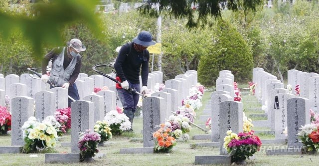 추석 연휴를 보름가량 앞둔 6일 대전 유성구 국립대전현충원에서 근로자들이 벌초 작업을 하고 있다.