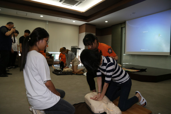 서울 영등포소방서는 지난 5일 오후 당산동 소재 충북학사에서 소방안전교육을 실시했다. 충북학사는 충북 도민 자녀들의 대학생할 편의를 위해 영등포구에 운영되고 있는 장학시설이다. 사진은 참여자들이 심폐소생술 실습을 하고 있는 모습. (사진제공=영등포소방서)