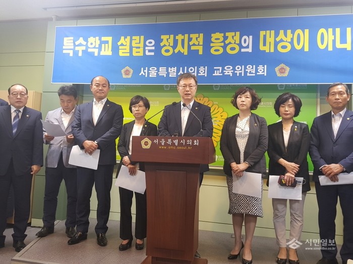 [시민일보=이진원 기자]서울시의회 교육위원회가 7일 오후 자유한국당 김성태 국회의원과 조희연 서울시교육감의 '강서특수학교 합의'와 관련, 기자회견을 열고 "특수학교 설립에 있어 정치적 타협이 있어선 안된다"며 비판하고 나섰다.
