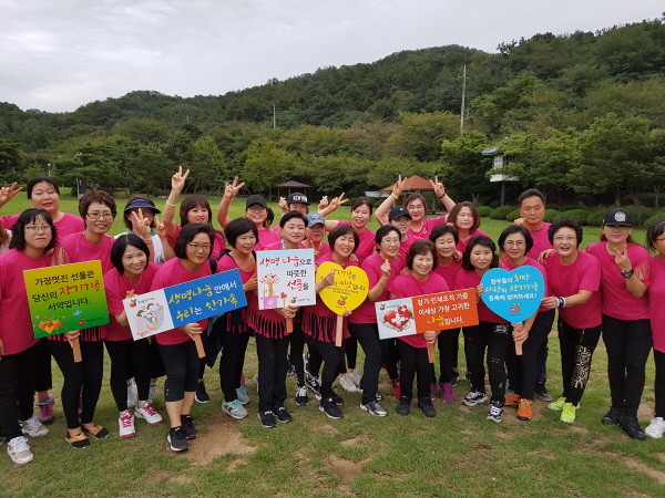 충남 아산시보건소는 지난 6일 신정호에서 달빛 건강걷기행사에 참여한 아산시민 등을 대상으로 사랑의 장기·인체조직 기증 캠페인을 전개했다. 사진은 캠페인 참여자들이 기념촬영을 하고 있는 모습.(사진제공=아산시청)