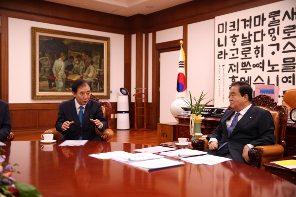 박윤국 경기 포천시장이 지난 6일 국회를 방문해 문희상 국회의장을 접견하고, 군 사격장 관련 지역현안을 설명하고 국회 차원에서의 협력을 요청했다. 사진은 박 시장(왼쪽)이 문 의장에게 군 사격과 관련 현안에 대해 설명하고 있는 모습.(사진제공=포천시청)