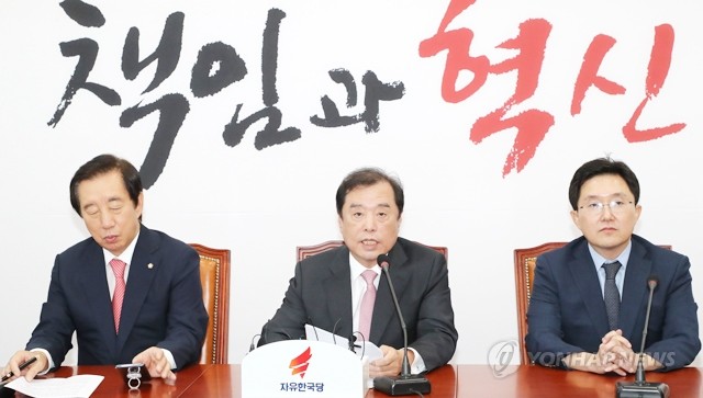 자유한국당 김병준 비상대책위원장(가운데)이 9일 오전 국회에서 판문점 선언 비준 동의에 관련해 긴급 기자간담회를 열고 발언하고 있다.
