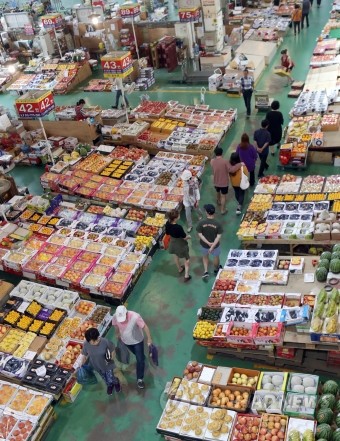 추석 연휴가 2주 앞으로 다가온 9일 부산 해운대구 반여농산물도매시장에서 시민들이 과일을 살펴보고 있다.