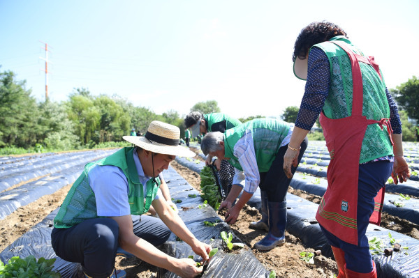 새마을운동하남시지회는 지난 7일 선동 휴경지 일원에 1만포기의 김장용 배추를 심었다. 이날 심은 배추는 오는 11월께 수확해 김장을 담가 어려웃 이웃에게 전달할 예정이다. 사진은 배추를 심고 있는 회원들의 모습. (사진제공=하남시청)
