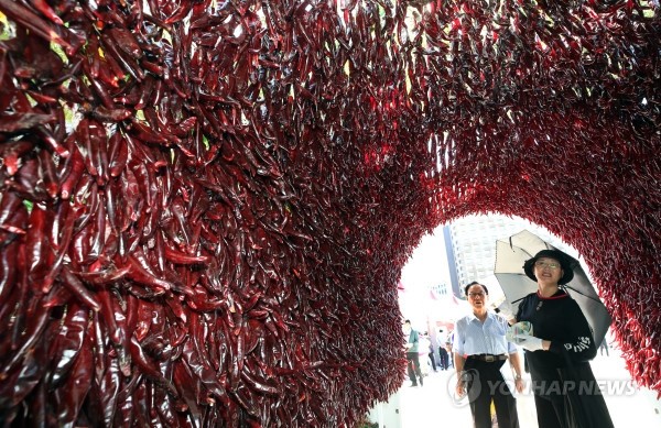10일 서울 중구 서울시청 앞 광장에서 열린 '2018 영양고추 핫페스티벌'에서 시민들이 고추로 만든 터널을 지나고 있다.