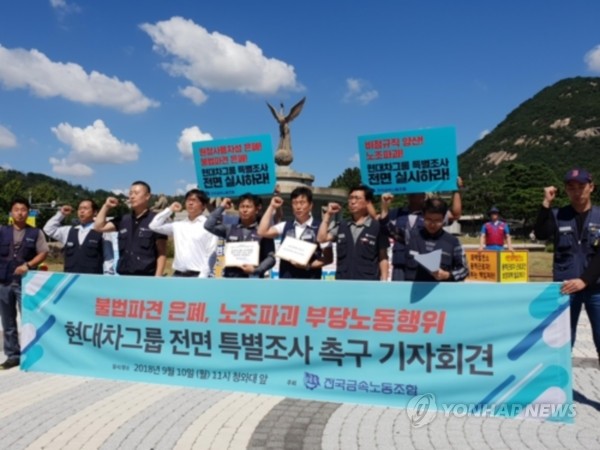 | ▲ 전국금속노동조합은 10일 서울 종로구 청와대 앞 분수대 광장에서 기자회견을 하고 현대제철이 불법파견을 은폐하고 노동조합을 파괴하는 내용이 담긴 문건을 발견했다며 정부에 특별근로감독을 요청했다.(사진제공=연합뉴스) | ||
