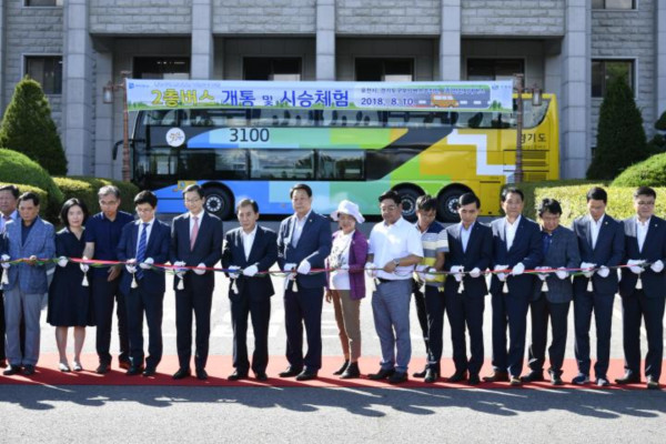 | ▲ 대진대학교~양재역을 운행하는 3100번 2층버스 도입식이 진행 중인 모습. (사진제공=포천시청) | ||