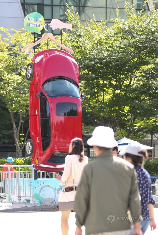 11일 오전 서울시청 신청사 서편에 '서울 차 없는 날' 상징조형물을 시민들이 바라보고 있다. '서울 차 없는 날'조형물은 자동차가 옷걸이에 걸려 있는 형태로 ‘차는 (옷걸이 걸어) 집에 두고 나오세요' 라는 의미를 담고 있으며, 서울 차 없는 주간(9.10~9.16)동안 전시한다.