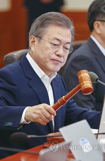 문재인 대통령이 11일 오전 청와대에서 열린 국무회의에서 의사봉을 두드리고 있다.