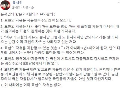 이후 그는 '짧은 표현의 자유 강의'라는 제목으로 글을 게시했다.