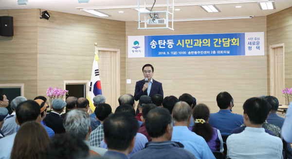 정장선 경기 평택시장이 최근 송탄동 주민센터에서 송탄동민과 지역구 도·시의원을 비롯해 어린이집 원장, 초등학교 학부모회, 아파트 동대표 등 120여명의 다양한 계층과 함께 ‘시민과의 간담회’를 개최했다. 사진은 주민들과 토론을 하고 있는 정 시장의 모습. (사진제공=평택시장)