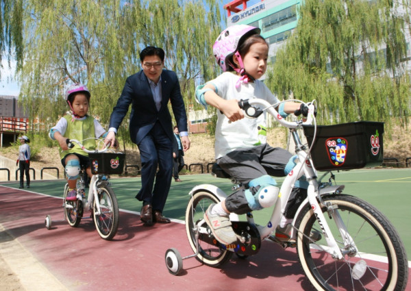 11일 이정훈 강동구청장이 ‘찾아가는 현장구청장실’의 일환으로 상일동 강동바이크 교육장을 방문, 자전거 교실에 참여한 어린이들의 바람을 듣고, 행복나눔 자전거 연맹 주민들과 대화하는 시간을 가졌다. 사진은 자전거를 타고 있는 어린이들과 함께 달리고 있는 이 구청장의 모습. (사진제공=강동구청)