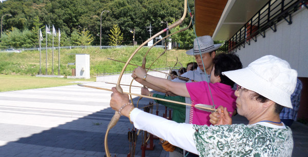 경기 남양주시 별내동 주민자치위원회가 12일 새내기 주민을 대상으로 별내동의 역사·전통을 알리는 ‘요리조리 동네마실 프로그램’을 진행했다. 사진은 프로그램에 일환으로 국궁장을 방문한 참가자들이 국궁 체험을 하는 모습. (사진제공=남양주시청)