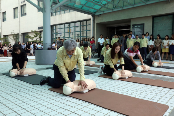 12일 서울 강남구청에서 제408차 민방위의 날을 맞아 구청 전직원과 구청을 방문한 민원인들이 참여한 가운데 지진대피훈련을 실시했다. 사진은 강남구청 직원들이 지진대피 훈련을 마친 뒤 심폐소생술 훈련을 실시하고 있는 모습. (사진제공=강남구청)