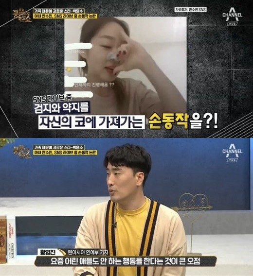13일 주요 포털사이트 실시간 검색어 상위권에 '한수민 손동작'이 올랐다. 이와 관련해 지난 10일 방송된 채널A 프로그램에서의 내용이 주목받고 있다. 이날 방송에서는 '가족 때문에 구설수에 오른 스타들'이란 주제를 가지고 이야기를 나눴다.