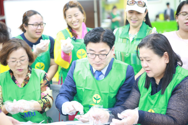 지난 11일 이정훈 서울 강동구청장이 강동구민회관 다목적실에서 열린 ‘2018년 추석맞이 사랑의 송편나눔’ 행사에 참석해 주민들과 송편을 빚어 지역사회 소외계층 90여가구에 송편을 전달했다. 사진은 주민들과 송편을 빚고 있는 이 구청장(가운데)의 모습. (사진제공=강동구청)