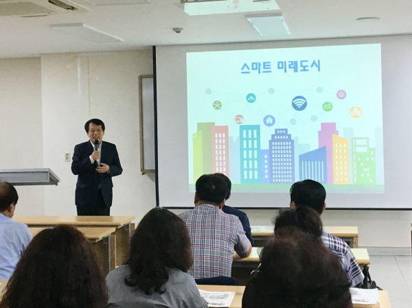 12일 이성 서울 구로구청장이 서울대학교 교육정보관에서 열린 ‘구로구·서울대 시민지도자 아카데미’에서 ‘스마트도시의 미래’를 주제로 강의를 실시했다. 사진은 강의를 진행 중인 이 구청장의 모습. (사진제공=구로구청)