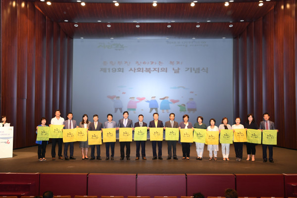 경기 구리시가 12일 구리아트홀에서 구리지역사회보장협의체와 구리시사회복지협회 주관으로 ‘제19회 사회복지의 날 기념행사’를 개최했다. 사진은 안승남 시장 등의 관계자들이 퍼포먼스에 참여한 모습. (사진제공=구리시청)