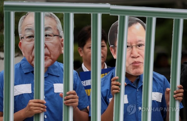 | ▲ 13일 오전 서울 서초구 대법원 앞에서 열린 양승태 사법농단 대응을 위한 시국회의 기자회견에서 참가자들이 양승태 전 대법원장과 박병대 전 법원행정처장(대법관)의 얼굴탈을 쓰고 구속 퍼포먼스를 하고 있다.(사진제공=연합뉴스) | ||