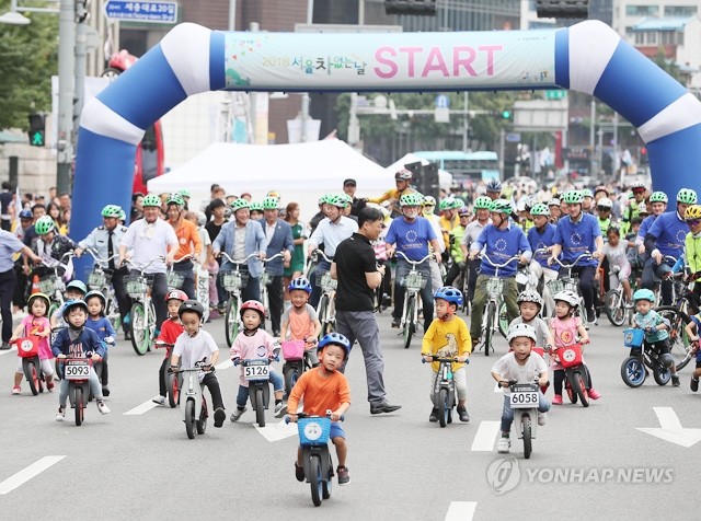 16일 오전 서울 세종대로 일부 구간(광화문 삼거리~대한문)에서 서울시 주최로 열린 ‘서울 차 없는 날’에서 어린이들이 자전거를 타고 무동력 퍼레이드를 하고 있다.