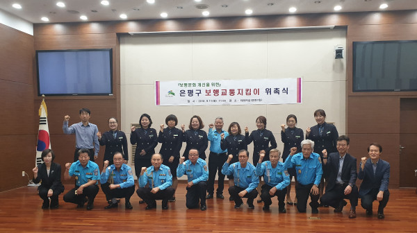 서울 은평구가 최근 보행환경 개선을 위한 ‘보행교통지킴이 위촉식’을 개최하고, 지역내 모범운전자연합회와 녹색어머니연합회의 추천을 받은 20명의 은평구 보행교통지킴이에 위촉장을 수여했다. 사진은 위촉식 후 기념촬영을 하고 있는 보행교통지킴이들의 모습. (사진제공=은평구청)