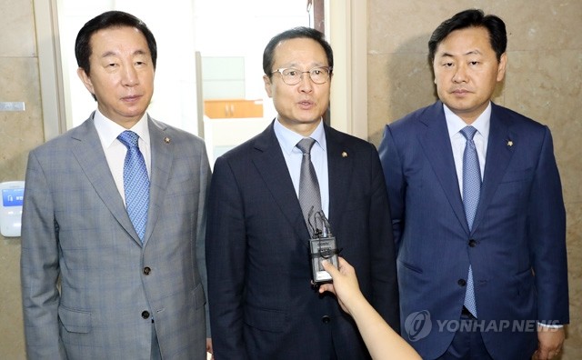 더불어민주당 홍영표, 자유한국당 김성태, 바른미래당 김관영 원내대표가 17일 국회 운영위원장실에서 회동을 마친 후 기자의 질문에 답하고 있다.