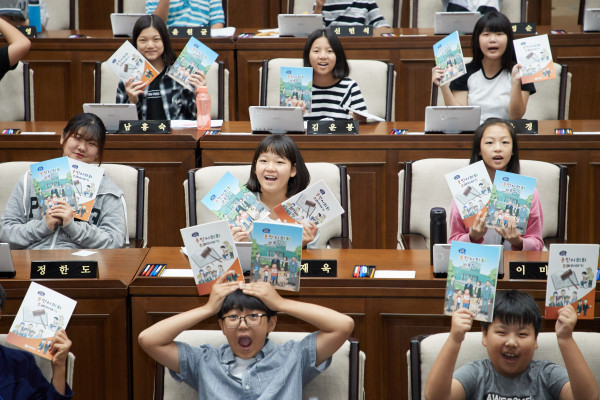 경기 용인시의회에서 운영하는 청소년 지방자치아카데미에 참여한 모현초등학교 6학년 학생들이 의회청사내 본회의장에서 기념촬영을 하고 있다.